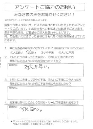 望まれる対応、サービスの欄にご記入いただいた件につきまして、承知いたしました。今後とも引き続きどうぞ宜しくお願いいたします。 |